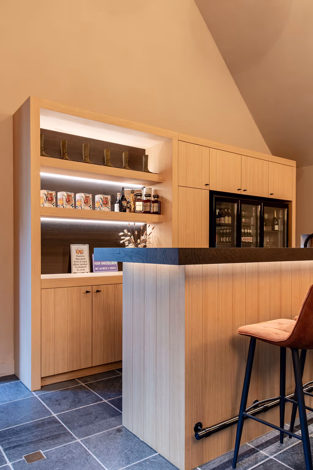 De bar werd volledig op maat ontworpen, met aandacht voor proportie, comfort en gebruik. Open legplanken, gesloten kasten en geïntegreerde koeling zorgen voor een opstelling die zowel praktisch als uitnodigend is.