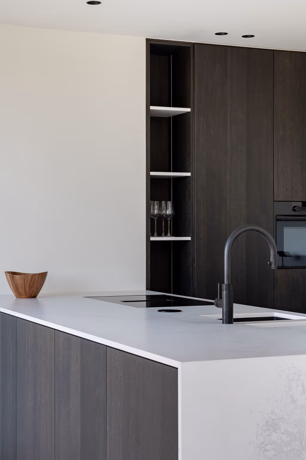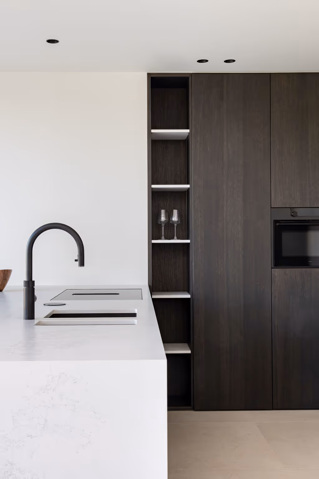 De keuken werd volledig op maat ontworpen, afgestemd het gemak en dagelijkse gebruik van de bewoners. Donker hout zorgt voor diepte en warmte, terwijl het natuurstenen werkblad het geheel een stevige, duurzame basis geeft.